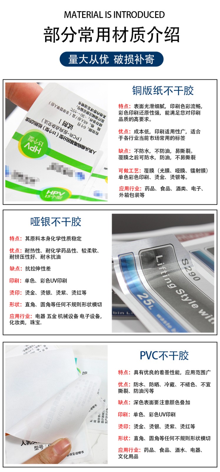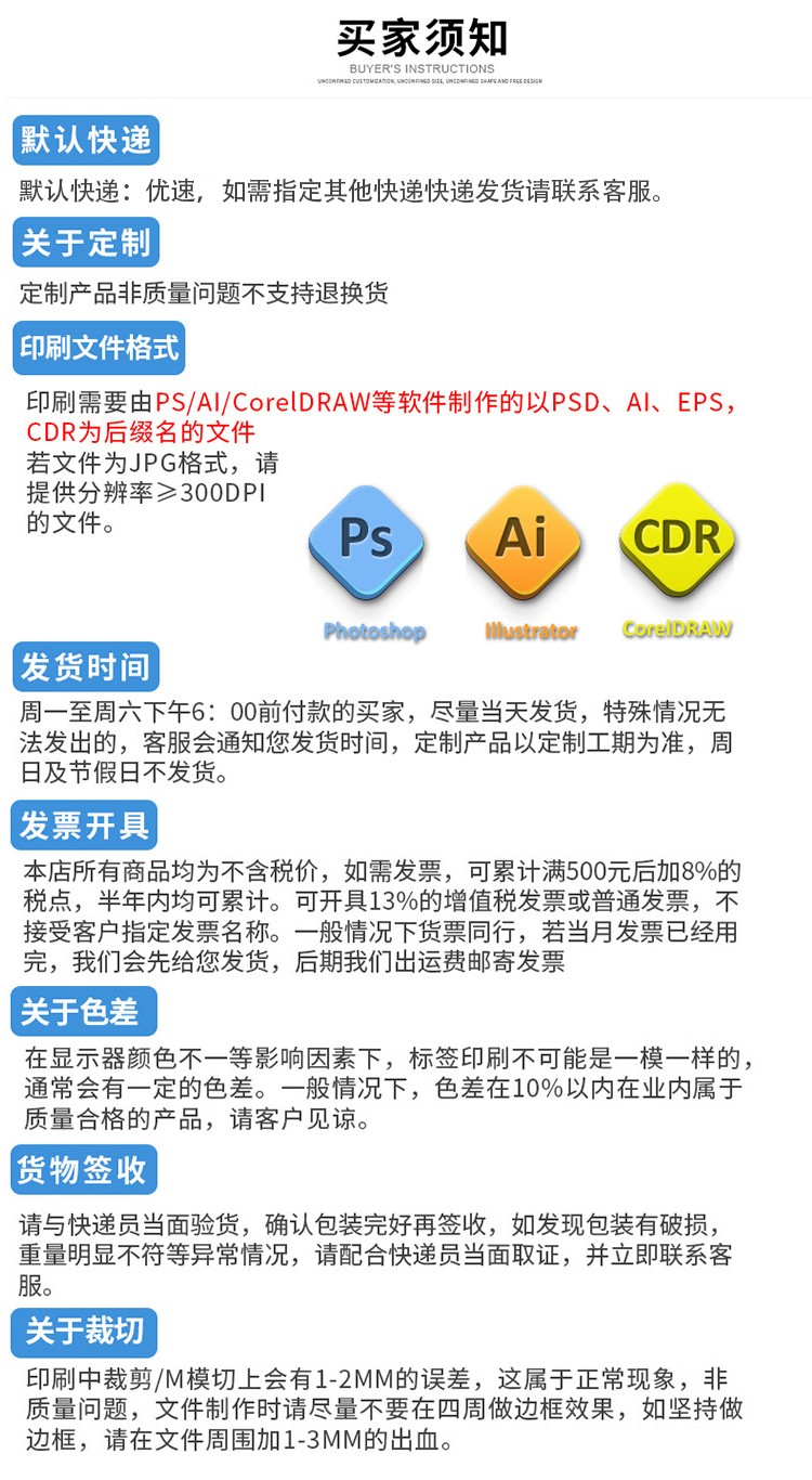產(chǎn)品名稱::?不干膠印刷,標(biāo)簽印刷,瓶貼印刷,不干膠(標(biāo)簽)印刷 常用尺寸::?按需要定制 常用材質(zhì)::?銅版紙不干膠,鋁箔紙不干膠,激光鐳射膜不干膠,易碎紙不干膠標(biāo)簽,PVC不干膠標(biāo)簽,PP(聚丙烯)不干膠標(biāo)簽,更多材質(zhì)請咨詢客服 加工工藝::?覆啞膜、覆光膜 出貨周期::?無需工藝3天,需覆膜4天,更多工藝請咨詢客服