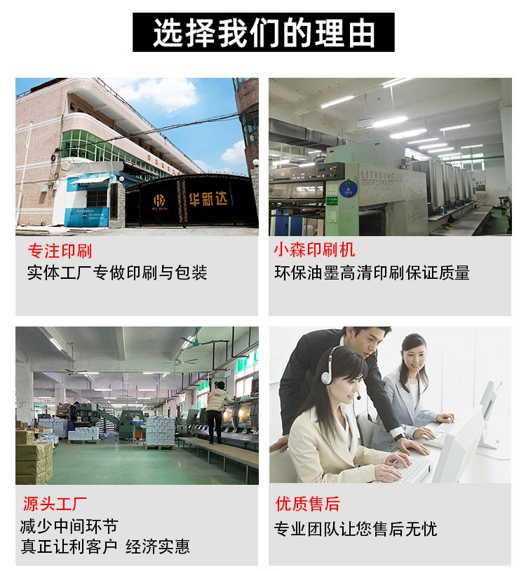 服務(wù)團隊:業(yè)務(wù)團隊均由從事五年以紙品印刷經(jīng)驗的專業(yè)人員擔(dān)任,采用1對1全程跟蹤貼心服務(wù)模式,并提供專業(yè)設(shè)計師配合。線下23年的大牌直供經(jīng)驗,各類工藝成熟,從定制、印刷、設(shè)計、售后一條龍服務(wù),以合理的價格竭誠為廣大客戶提供最優(yōu)質(zhì)的產(chǎn)品和服務(wù)。