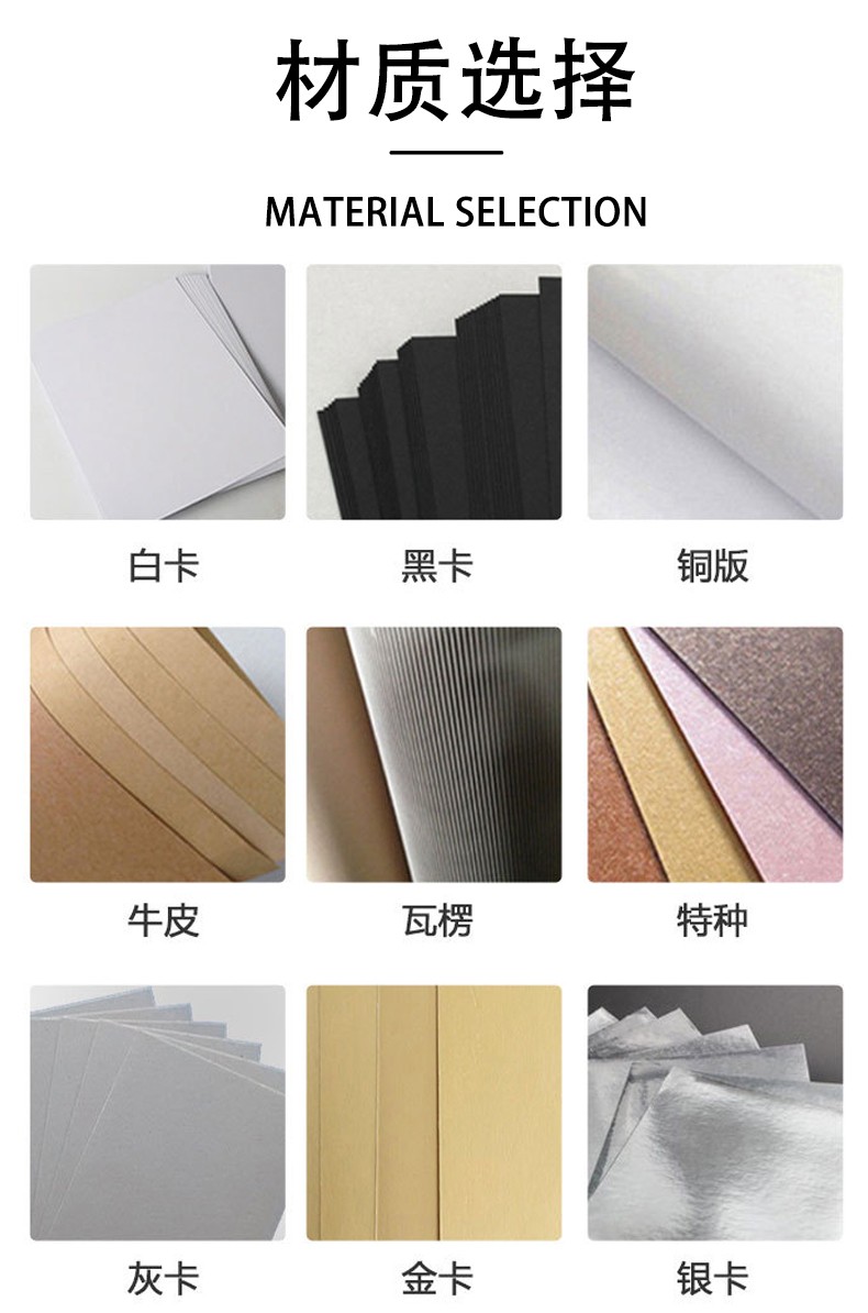 常用尺寸::?按需訂做 常用紙張::?單銅紙(白卡):250克、300克、350克、400克; 牛皮紙(白牛/黃牛):250克、300克、350克、400克; 白板紙(灰底白):250克、300克、350克、400克; 特種紙(常用120克裱于灰板紙上,品種繁多) 瓦楞紙(裱于單銅或白板面紙上,一般應(yīng)用于產(chǎn)品外包裝盒) 常用工藝::?啤、粘、過光/啞膠、UV、擊突、燙金/銀