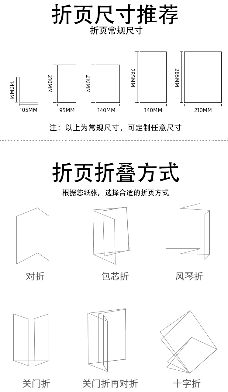 宣傳折頁(yè)印刷,宣傳物料印刷,折頁(yè)印刷 常用尺寸:?jiǎn)挝籱m:?210×285、420×285、285×630、285×840; 常用紙張:?雙銅紙、啞粉紙、雙膠紙、超感紙 (建議克數(shù):157克、200克、230克、250克) 常用工藝:?過(guò)光/啞膠、局部UV、壓紋、擊突、燙金/銀、印專金/專銀 出貨周期:?紙張200克以下厚度一般2~3天,紙張200克以上厚度壓線折頁(yè)一般3~4天(定稿起計(jì)) 包裝方式:?紙箱